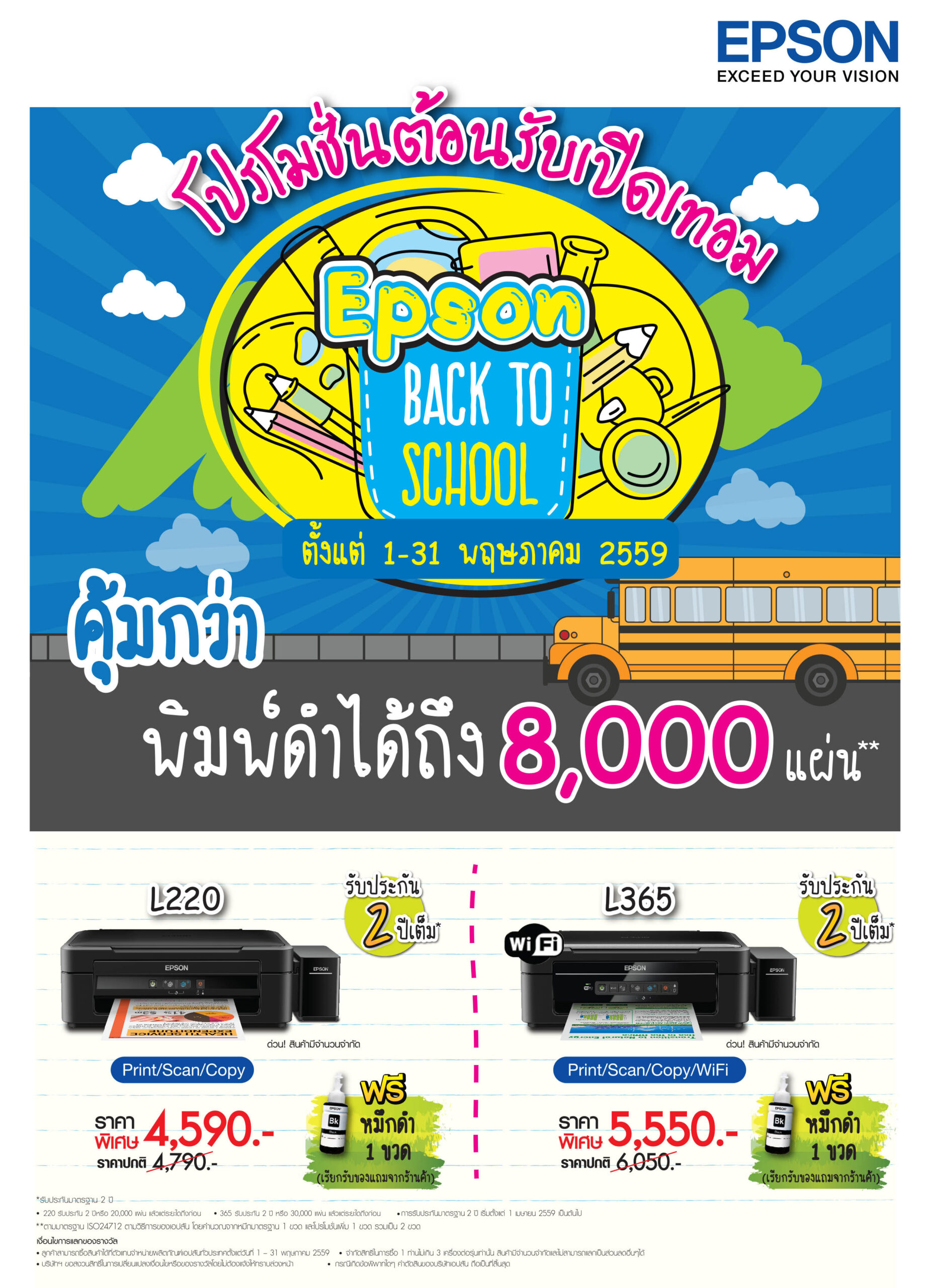 เอปสัน ต้อนรับเปิดเทอมส่งโปรโมชั่น Epson Back to School กับเครื่องพิมพ์แท็งค์แท้ราคาประหยัดหลากหลายรุ่นมาให้เลือกซื้อในราคาพิเศษ เหมาะสำหรับนักเรียน นักศึกษาที่ต้องการพิมพ์งานเอกสารตลอดปีการศึกษา ประกอบด้วยรุ่นยอดนิยม Epson L220 พิเศษเพียง 4,590 บาท จากปกติ 4,790 บาท และ Epson L365 พิเศษเพียง 5,550 บาท จากปกติ 6,050 บาท สุดพิเศษ! รับเพิ่มฟรีทันที หมึกดำ 1 ขวด มูลค่า 250 บาท และพบกับข้อเสนออื่นๆ จาก Epson Back to School ได้ตั้งแต่วันที่ 1 – 31 พฤษภาคม 2559 ติดตามรายละเอียดและโปรโมชั่นเพิ่มเติมได้ที่ www.epson.co.th หรือ Fanpage: EpsonThailand