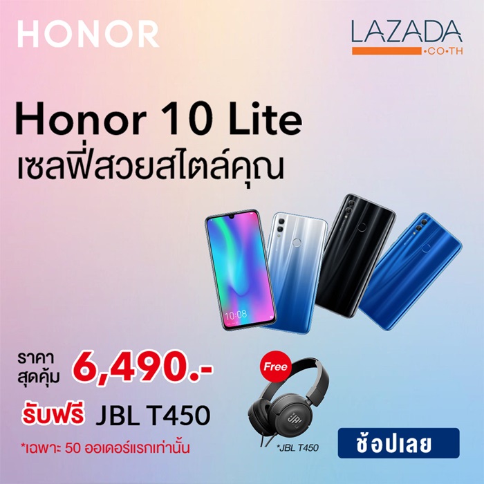พิเศษสุด!สำหรับลูกค้า 50คนแรกที่ซื้อHONOR 10 Lite ผ่านช่องทาง Lazada รับหูฟัง JBL รุ่น T450 ฟรีทันที นอกจากนี้ภายในวันที่ 2 กุมภาพันธ์ ออเนอร์ยังจัดกิจกรรมพิเศษให้แฟนๆและลูกค้าสามารถมาร่วมสนุกลุ้นรับชุดของขวัญสุดพรี่เมี่ยม โดยกิจกรรมจะจัดขึ้นที่ร้านค้า HONOR Shop สาขาMBK ชั้น 5 และ ร้านค้าตัวแทนจำหน่าย CSCสาขาซีคอน บางแค และซีคอน ศรีนครินทร์ ตั้งแต่เวลา 12.00 น. เป็นต้นไป รีบมาร่วมสนุกกันของรางวัลมีจำนวนจำกัด