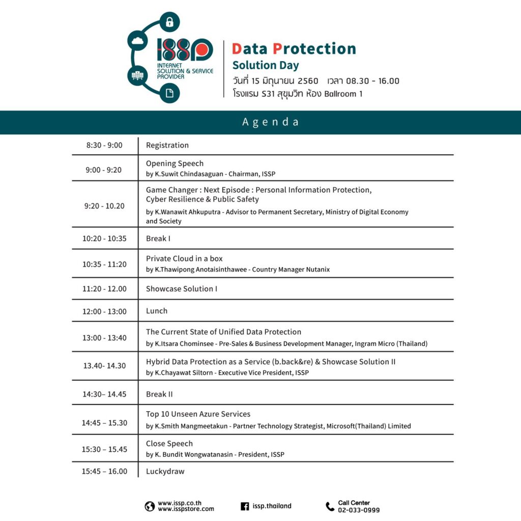 งานสัมมนา “ISSP Data Protection Solution Day” จะจัดขึ้นในวันพฤหัสบดีที่ 15มิถุนายน 2560 ตั้งแต่เวลา 08.30 – 16.00 น. ณ โรงแรม S31 สุขุมวิท ห้องแกรนด์บอลรูม 1 ผู้สนใจสามารถเข้าร่วมงานได้โดยไม่เสียค่าใช้จ่าย ผ่านการลงทะเบียนที่https://store.isspstore.com/static/issp/solutiondayinfo.html