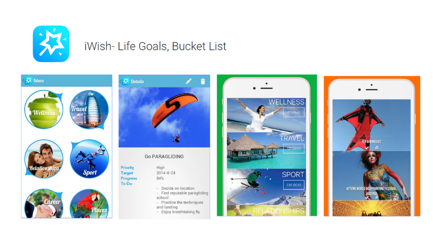 แอพพลิเคชั่นที่ถูกออกแบบมาช่วยในการตั้งเป้าหมายและติดตามเป้าหมายชีวิตที่คุณตั้งไว้ รวมไปถึงไอเดียและแรงบันดาลใจดี ๆ มากกว่า 1,200 อย่าง ไม่ว่าจะเป็นด้านสุขภาพ ความสัมพันธ์ การท่องเที่ยว กิจกรรมกีฬา การงานอาชีพ เป็นต้น ดังนั้นคุณจึงสามารถสนุกกับชีวิตได้อย่างสุดเหวี่ยงโดยไม่ต้องกังวลกับเป้าหมายของชีวิตที่คุณตั้งไว้ เพราะแอพฯ นี้จะช่วยเตือนและรายงานความคืบหน้าให้กับคุณอยู่เป็นประจำ
