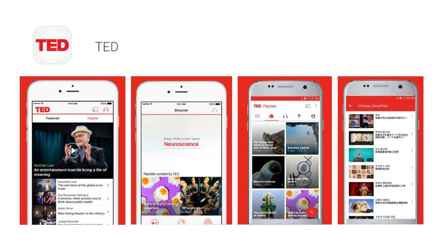 อีกหนึ่งแอพฯ ที่จะเป็นแรงบันดาลใจอันดีเยี่ยมให้กับชีวิตคุณ ด้วยคลิปวิดีโอจากเวที TED Talks ซึ่งเป็นอีกหนึ่งงานทอล์กโชว์จากคนดังที่ประสบความสำเร็จซึ่งออกมาพูดถึงหัวข้อต่าง ๆ ทั้งในด้านการงานและการดำเนินชีวิต รับรองว่าคุณจะถูกจุดประกายความคิดเด็ด ๆ พร้อมได้เรียนรู้แนวคิดใหม่ ๆ ได้อีกเยอะเลยทีเดียว