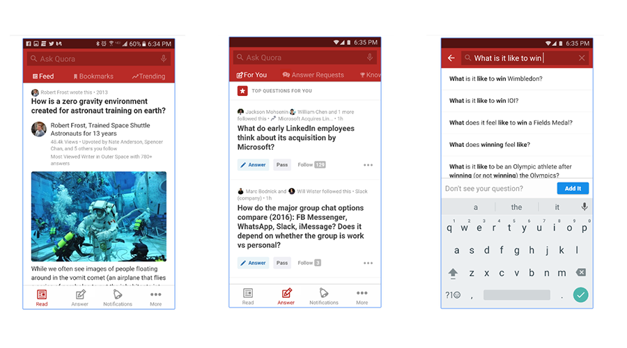 แอพพลิเคชั่นแรกที่อยากแนะนำก็คือ Quora เป็นแอพพลิเคชั่นที่มีรูปแบบเป็นการถาม-ตอบ โดยผู้ที่ใช้แอพพลิเคชั่นนี้จะเป็นคนที่มีความรู้ความสามารถในระดับสูง และเป็นผู้ที่รู้ลึก รู้จริง โดยจะมีการตั้งคำถามขึ้นไว้เป็นกระทู้ และจะมีผู้ที่มีความรู้ในด้านนั้น ๆ เข้ามาให้คำแนะนำและให้คำตอบ โดยคุณสามารถเข้าไปอ่านและศึกษาเกี่ยวกับข้อมูลต่าง ๆ ได้อย่างเปิดเผย ซึ่งจุดประสงค์หลักในการสร้างแอพพลิเคชั่นนี้ก็เพื่อให้ผู้คนได้มีโอกาสเข้ามาแลกเปลี่ยนความคิดเห็นจากทั่วทุกมุมโลก เพื่อที่คุณจะได้ผลลัพธ์ที่ดีที่สุดในการนำไปใช้ให้เกิดประโยชน์อย่างแท้จริง