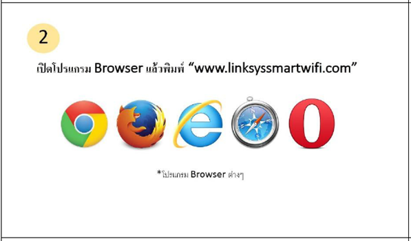 - เปิดโปรแกรมเบราเซอร์ (Brower) ไม่ว่าจะเป็น Google Chrome, IE, Firefox ฯลฯ แล้วพิมพ์ “linksyssmartwifi.com”