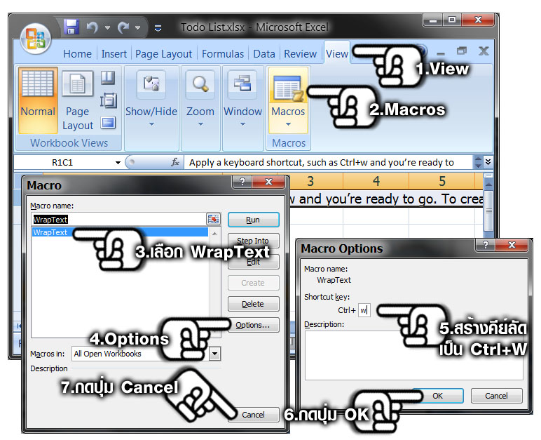 5.ในหน้าต่าง Macro Options ใส่คีย์ลัดเป็น Ctrl + W