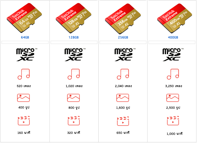 SanDisk Extreme MicroSDXC UHS-I Card เมมโมรี่การ์ดแบบ MicroSDXC ที่ออกแบบมาสำหรับการใช้งานบนมือถือสามาร์ทโฟนและกล้องแอ็คชันแคมขนาดเล็ก ที่มีประสิทธิภาพในการทำงานที่ยอดเยี่ยมมีความเร็วในการอ่านข้อมูลสูงสุดถึง 160 MB/s และ ความเร็วในการเขียนข้อมูลที่ 90 MB/s รองรับมาตรฐานความเร็ว Class 10, V30, U3, และ A2 เพื่อให้ได้ประสิทธิภาพในการถ่ายวิดีโอ ภาพนิ่ง และการเล่นเกมบนมือถือได้อย่างเต็มอรรถรส ตัวการ์ดมีพื้นจัดเก็บข้อมูลให้เลือกใช้ตั้งแต่ 64GB จนถึงขนาดสูงสุดที่ 400GB พร้อมรองรับการใช้งานได้ในทุกรูแบบเพื่อการใช้งานในแบบเอ็กซ์ตรีม