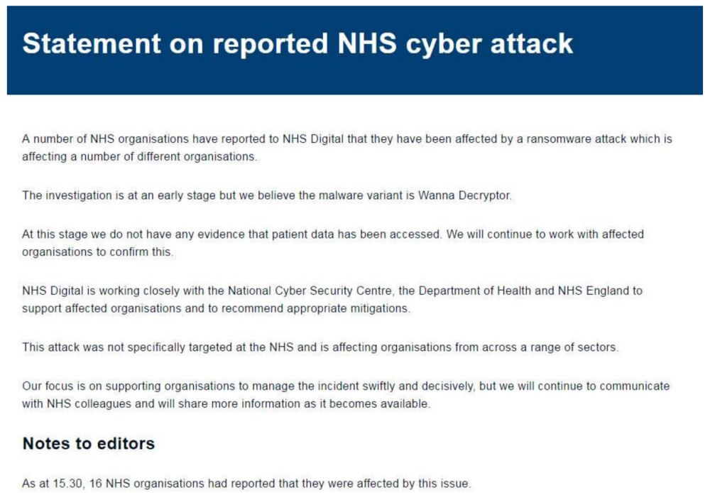 National Health Service hospitals (NHS) ในสหราชอาณาจักร ได้รับผลกระทบอย่างรุนแรงจากการโจมตีระยะแรก โดยทั้งระบบโทรศัพท์และบริการด้านไอทีอื่นๆ ต่างถูกกักไว้เรียกค่าไถ่ ทางฝ่ายไอทีของ NHS ได้โพสต์ประกาศว่า หน่วยงานในสังกัดหลายแห่งโดนแรนซั่มแวร์โจมตี โดยเชื่อว่าเป็นมัลแวร์ชื่อ Wanna Decryptor ซึ่งปัจจุบันยังไม่มีหลักฐานชี้ชัดว่าข้อมูลของผู้ป่วยถูกเข้าถึงด้วยหรือเปล่า แต่ก็กำลังทำงานร่วมกับศูนย์ความปลอดภัยทางไซเบอร์แห่งชาติอย่างใกล้ชิด และจะแจ้งความคืบหน้าอีกครั้งโดยเร็วที่สุด