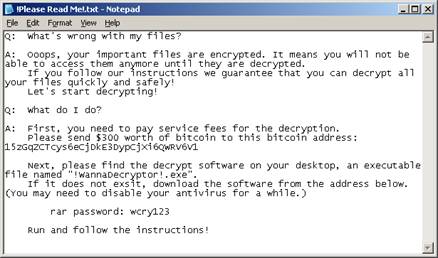 นอกจากนี้ มัลแวร์ดังกล่าวยังปล่อยไฟล์ที่มีชื่อว่า !Please Read Me!.txt ซึ่งประกอบด้วยจดหมายเรียกค่าไถ่
