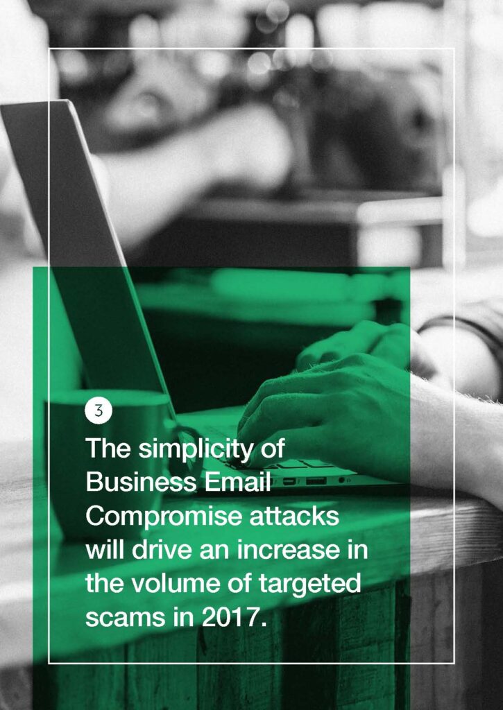 อีเมล์หลอกลวง (Business Email Compromise – BEC) และระบบธุรกิจถูกปรับเปลี่ยน (Business Process Compromise – BPC) จะยังเพิ่มขึ้นอย่างต่อเนื่อง เพราะเป็นวิธีการหลอกลวงที่ง่ายและมีค่าใช้จ่ายน้อยมาก การโจมตีด้วยวิธีการ BEC นี้อาจสร้างรายได้ให้แก่คนร้ายมากถึง 140,000 ดอลลาร์ ด้วยการล่อหลอกให้พนักงานโอนเงินไปยังบัญชีของคนร้าย ส่วนการเจาะเข้าสู่ระบบธุรกรรมทางการเงินโดยตรง ซึ่งเป็นวิธีการที่ยากกว่าจะสร้างรายได้เป็นกอบเป็นกำให้แก่คนร้ายโดยอาจสูงถึง 81 ล้านดอลลาร์เลยทีเดียว