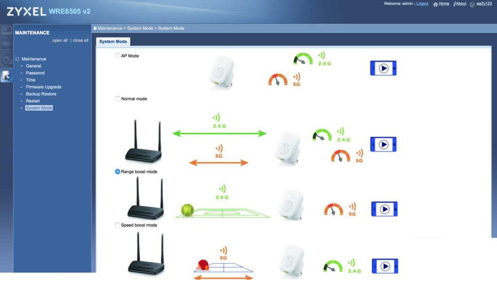 – Speed boost mode สำหรับเน้นการรับส่งข้อมูลที่รวดเร็ว โดยจะใช้สัญญาณ 5GHz เพื่อความรวดเร็วในการรับส่งข้อมูลระหว่างเครือข่ายในบ้านกับตัว Zyxel WRE6505 V2 แล้วจึงใช้สัญญาณ 2.4GHz ในการเชื่อมต่อกับอุปกรณ์ต่างๆ
